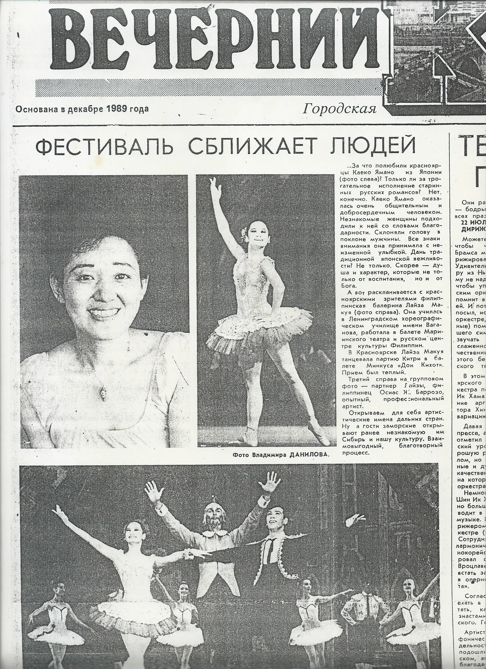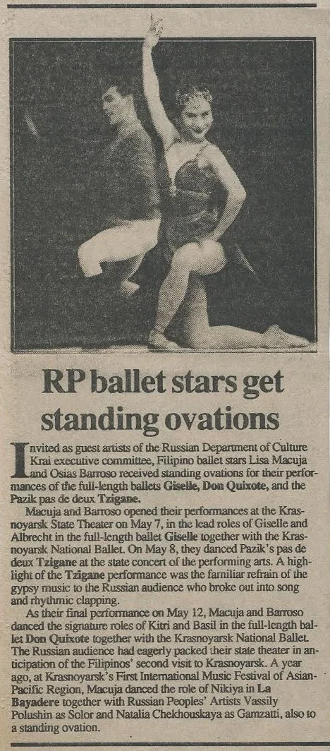 A clipping from a Russian newspaper in 1992 shows a triumphant Lisa Macuja and Osias Barroso (lower photo), the latter making his full-length debut in Don Quixote. Image courtesy of the Ballet Manila Archives