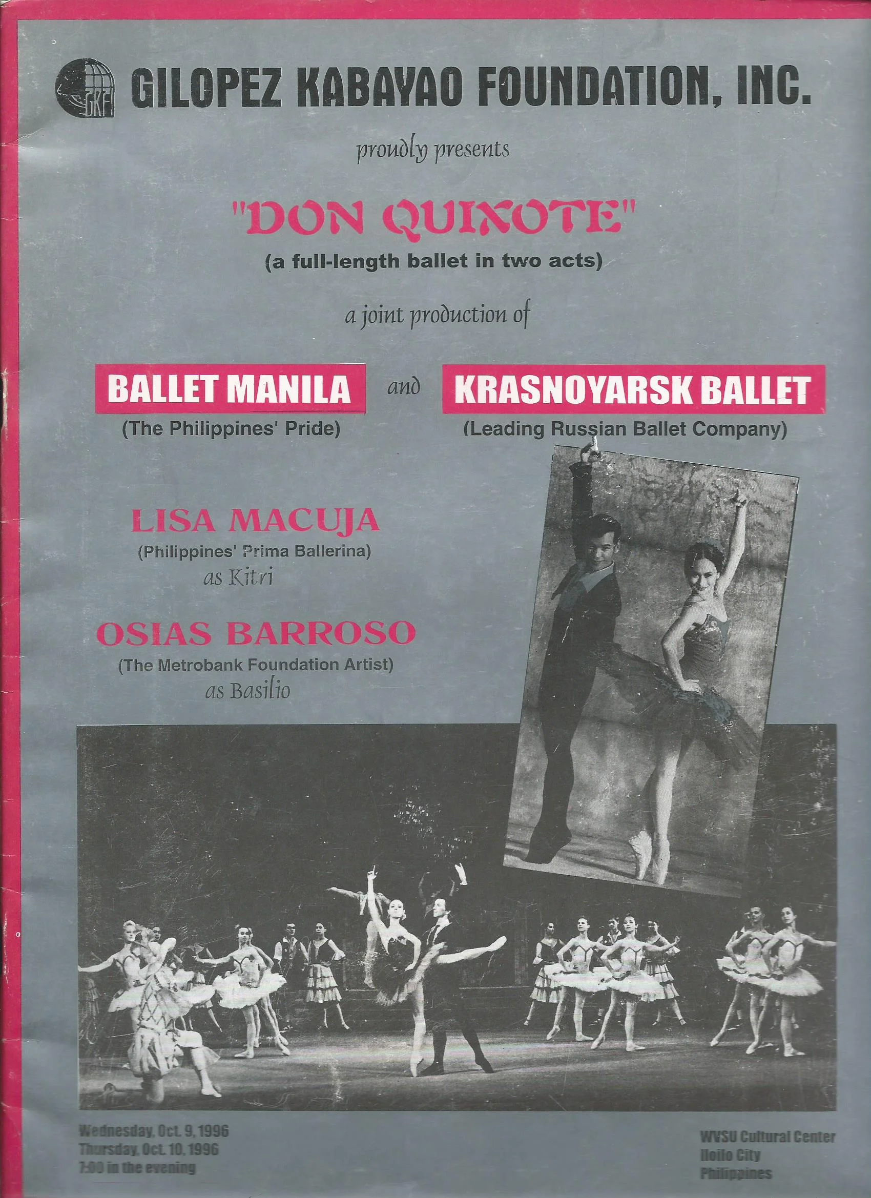 Ballet Manila performed Don Quixote for the first time in 1996 in collaboration with the Krasnoyarsk Ballet. Principal dancers Macuja-Elizalde and Barroso assumed the lead roles, as seen in this souvenir program for the Iloilo shows. Image courtesy of the Ballet Manila Archives