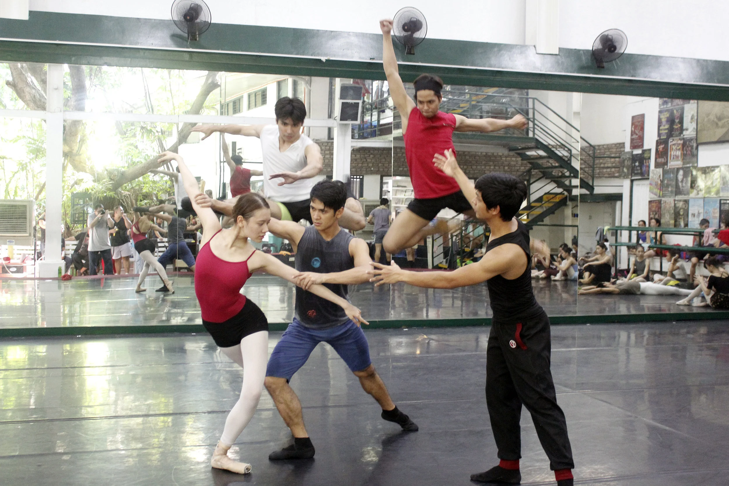 Geri coaches the first cast of Ibong Adarna – Abigail Oliveiro partnered by Rudy De Dios, and at the back, in mid-air, Romeo Peralta and Mark Sumaylo. Photo by Jimmy Villanueva