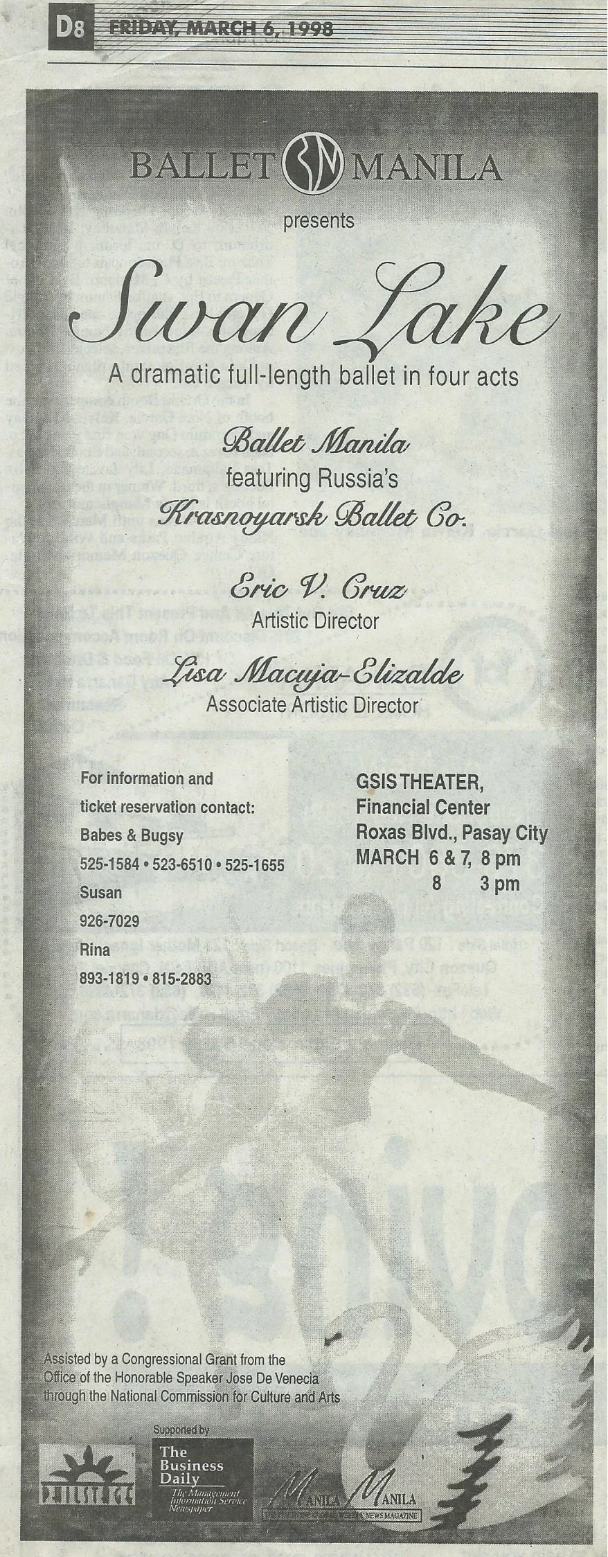 Ballet Manila premiered Swan Lake to kick off its first season at GSIS Theater, as indicated in this newspaper announcement. From the Ballet Manila Archives collection