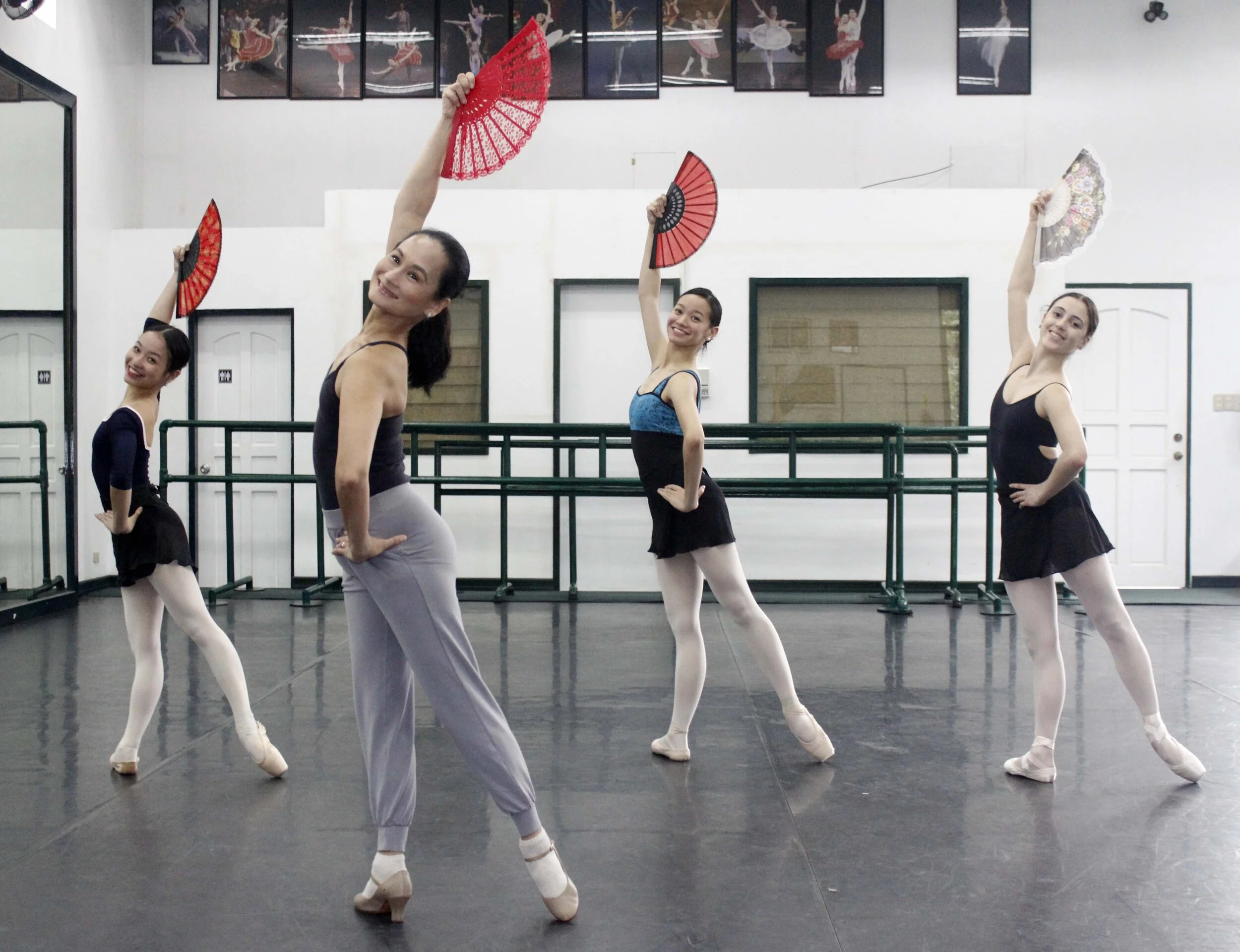 In 2017, five years after dancing her farewell Don Quixote, Lisa Macuja-Elizalde (foreground) coaches a new batch of Kitris in the skillful handling of the Spanish fan. With her are, from left: Jasmine Pia Dames, Dawna Reign Mangahas and Katherine Barkman. Photo by Jimmy Villanueva