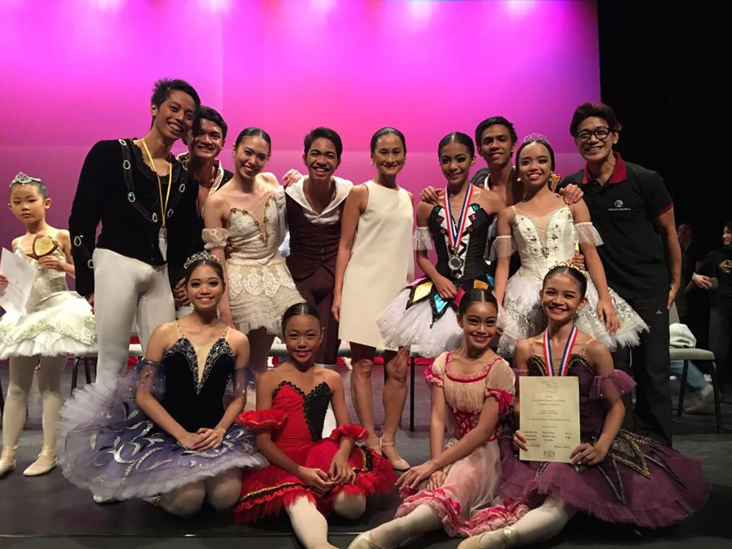 Earning fifth place in the Senior B category at the Asian Grand Prix in 2016, Rodney (leftmost) joins Ballet Manila co-artistic directors Lisa Macuja-Elizalde (fifth from left) and Osias Barroso (rightmost) and BM colleagues in this celebratory group photo after the competition in Hong Kong.