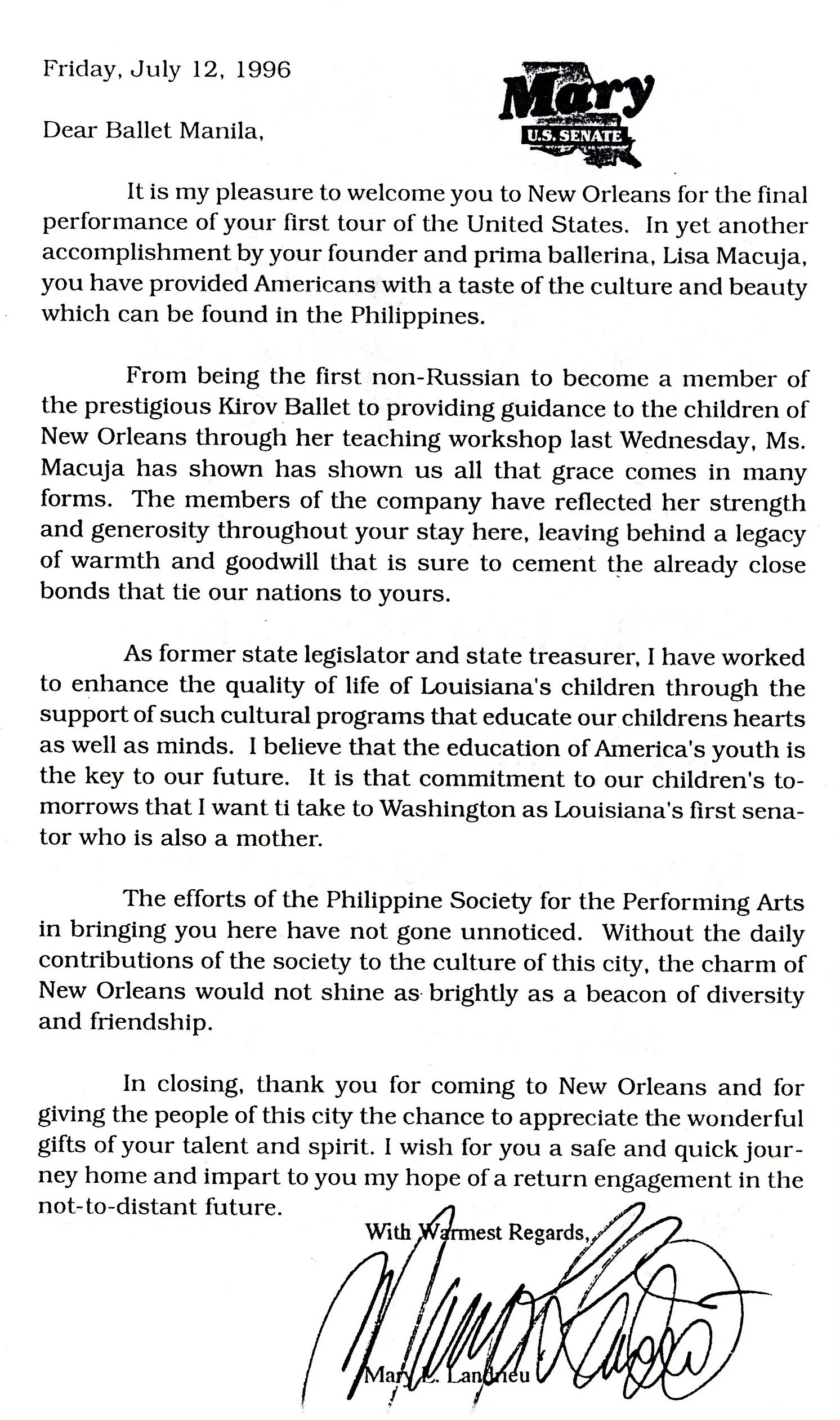 The letter of Mary Landrieu, Louisiana’s former state legislator and state treasure, is published in the souvenir program of Ballet Manila’s show in New Orleans. Souvenir program from the Ballet Manila Archives collection