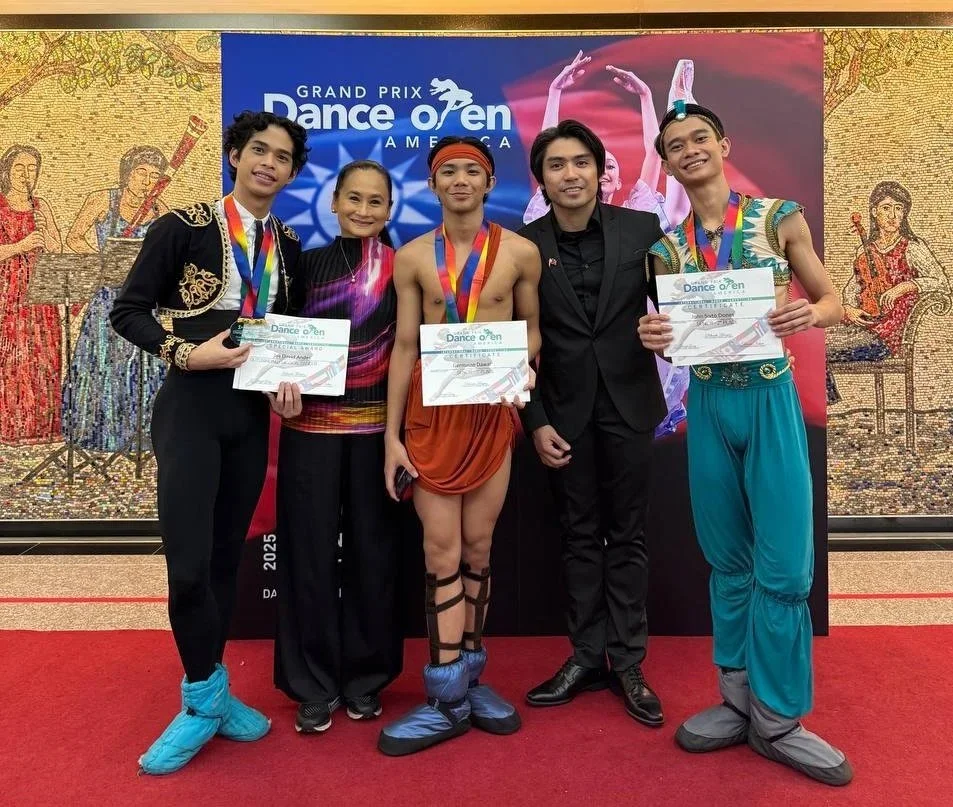 Together with Ballet Manila artistic director Lisa Macuja Elizalde, Romeo (fourth from left) celebrated the victories of danseurs Jos David Andes, Germaine Dawal and John Sixto Dones at the 2025 Dance Open America Taiwan Regionals last July.