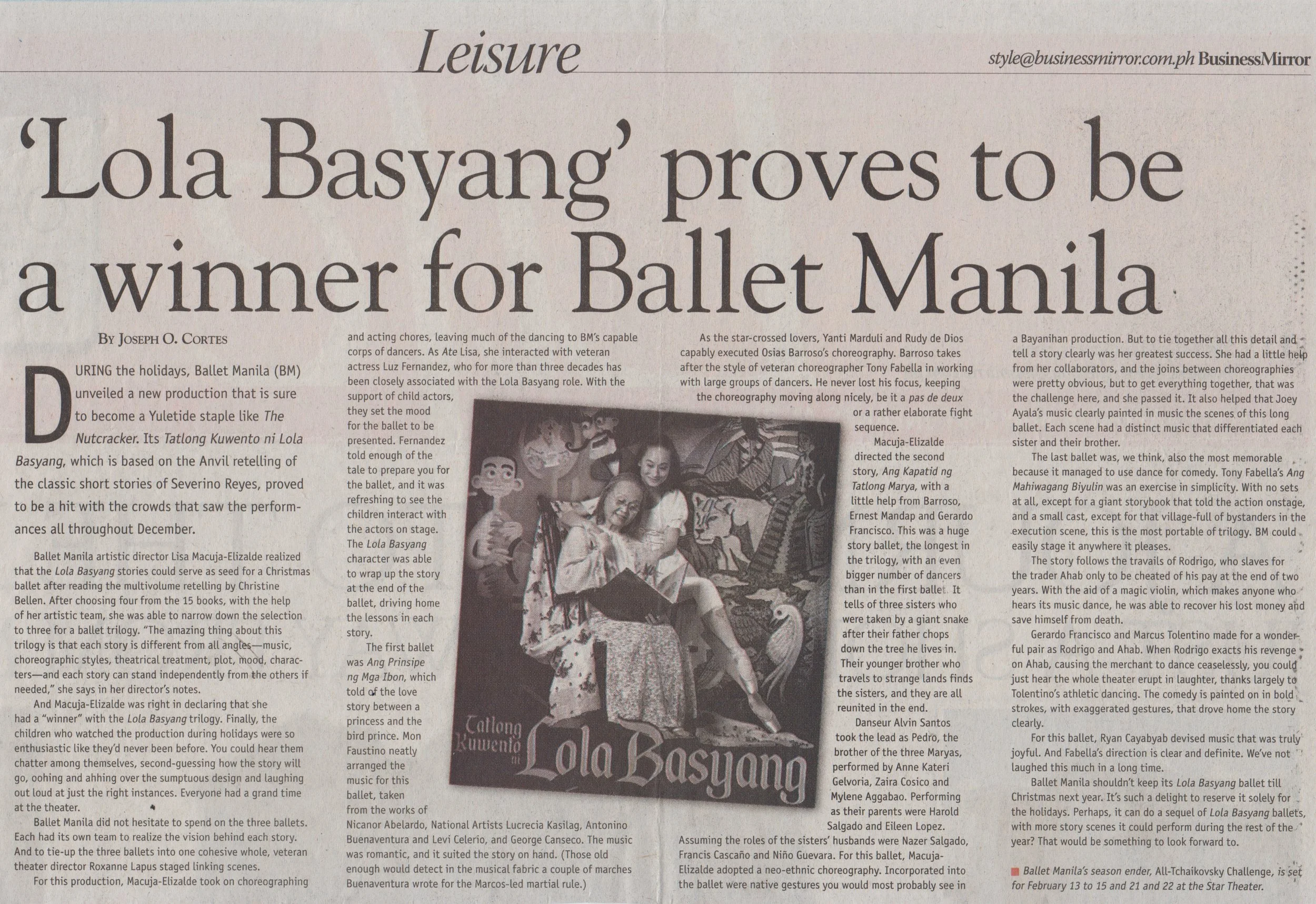 A story in Business Mirror mentions that Ballet Manila’s hit production, Tatlong Kuwento ni Lola Basyang, should be staged not just at Christmas. Clipping from the Ballet Manila Archives collection