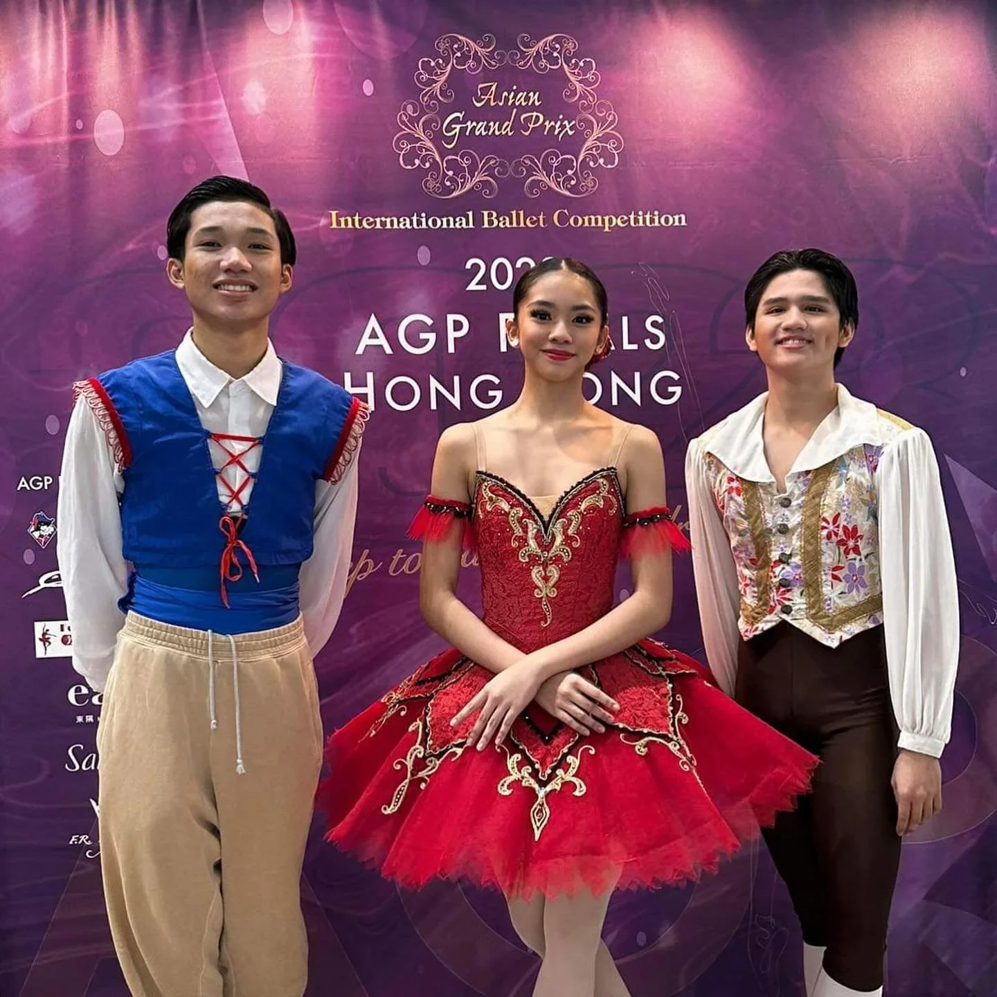 Shamira (center) finished fourth in the Junior B division of the 2023 Asian Grand Prix in Hong Kong, competing alongside then Ballet Manila scholars John Stanley Alamer (left) and Juan Angelo De Leon.